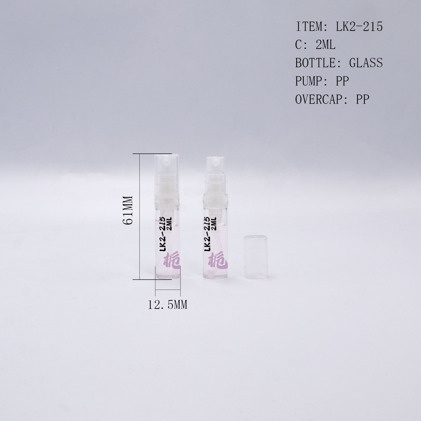 A classic, sleek, slender and straight cylindrical bottle with a capacity of 2ml. Equipped with a 12-tooth perfume spray pump (including outer cap, collar, nozzle, and button made of PP; gasket made of silicone; and straw made of PE), this bottle can be used as a container for perfume products. The entire set of products is made of environmentally friendly materials.