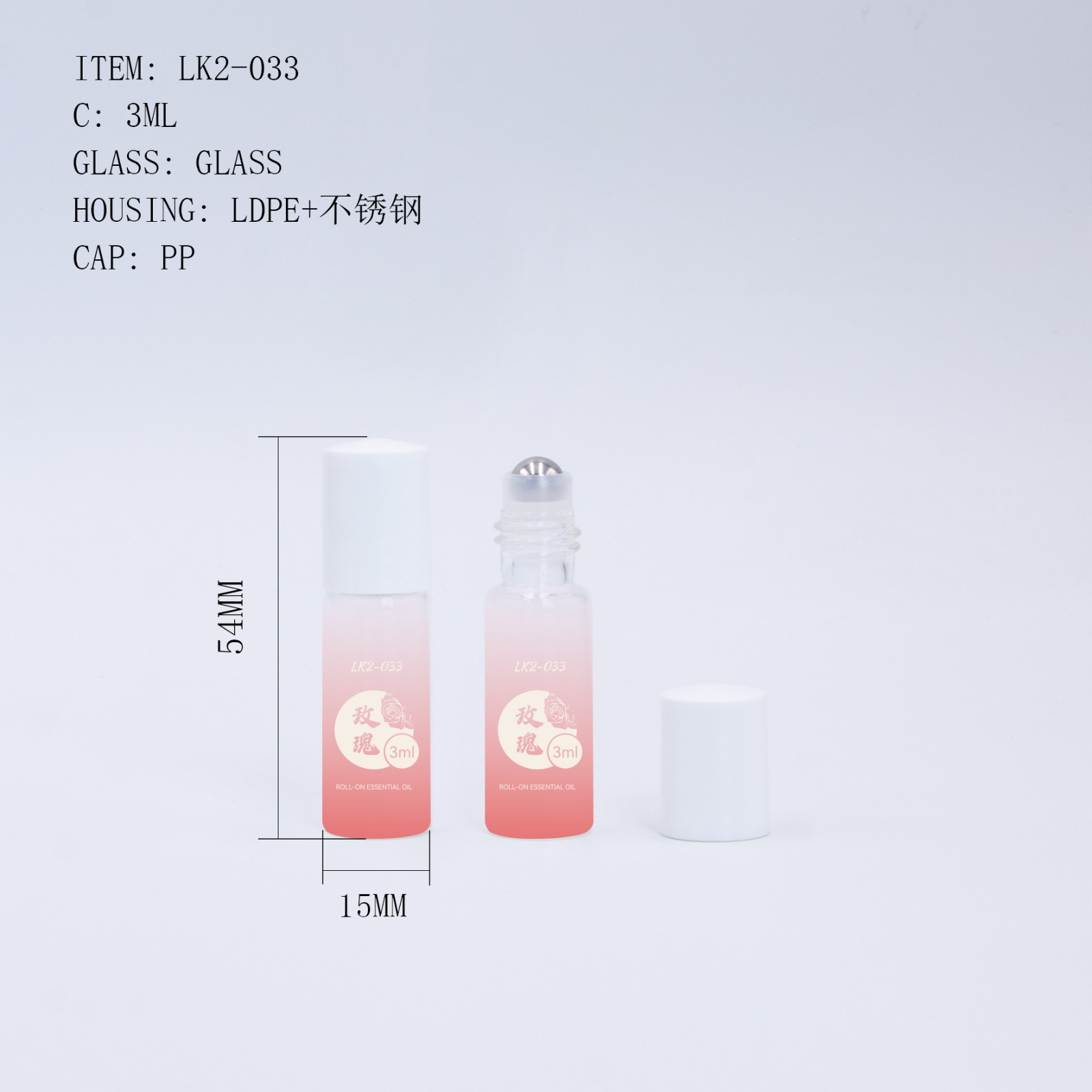 3ml Capacity Bottle: A sleek and streamlined cylindrical bottle equipped with a full-plastic rollerball cap (outer cap made of PP, ball holder of LDPE, and steel rollerball). This bottle is designed for easy and convenient use, serving as an ideal sample container for various products such as roll-on perfumes, lip serums, and eye serums.