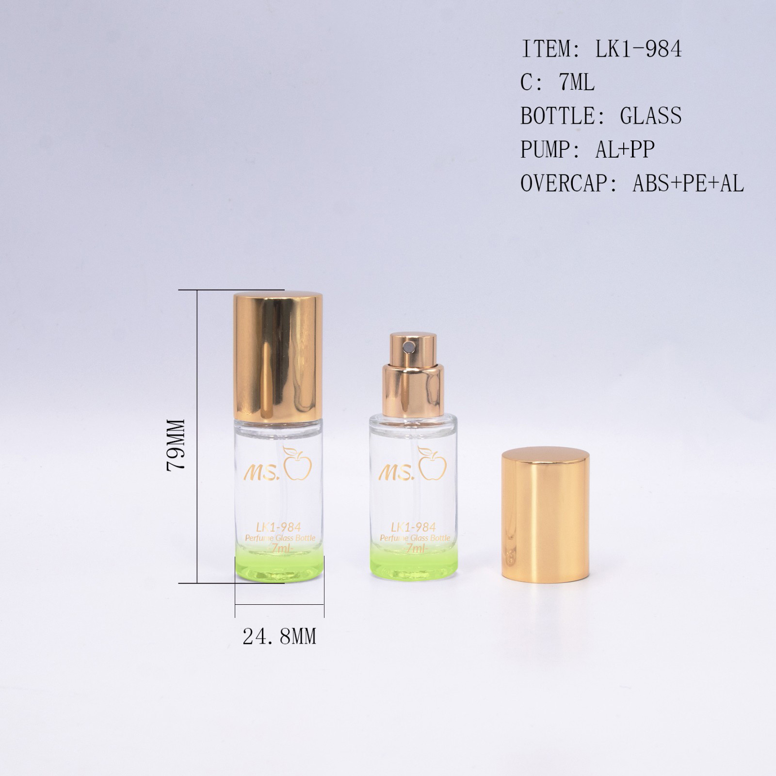 Bottle type with 7ml capacity: a simple and neat straight cylindrical bottle, equipped with a 15-tooth aluminum clip perfume spray pump and anodized aluminum cap (with PE inner lining, ABS middle cap, aluminum outer cap, PE straw, POM nozzle, ALM+PP button, ALM collar, and silicone gasket). This bottle can be used as a container for perfume products.